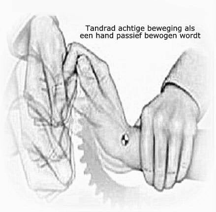 De typische stijfheid: tandrad-achtige beweging als een hand of arm passief bewogen wordt over een gewricht. (tandrad-rigiditeit / tandradfenomeen) Het is een gevoel van een hortende en stotende weerstand wanneer een gewricht van een patiënt wordt bewogen door een ander, als gevolg van een verhoogde spierweerstand.