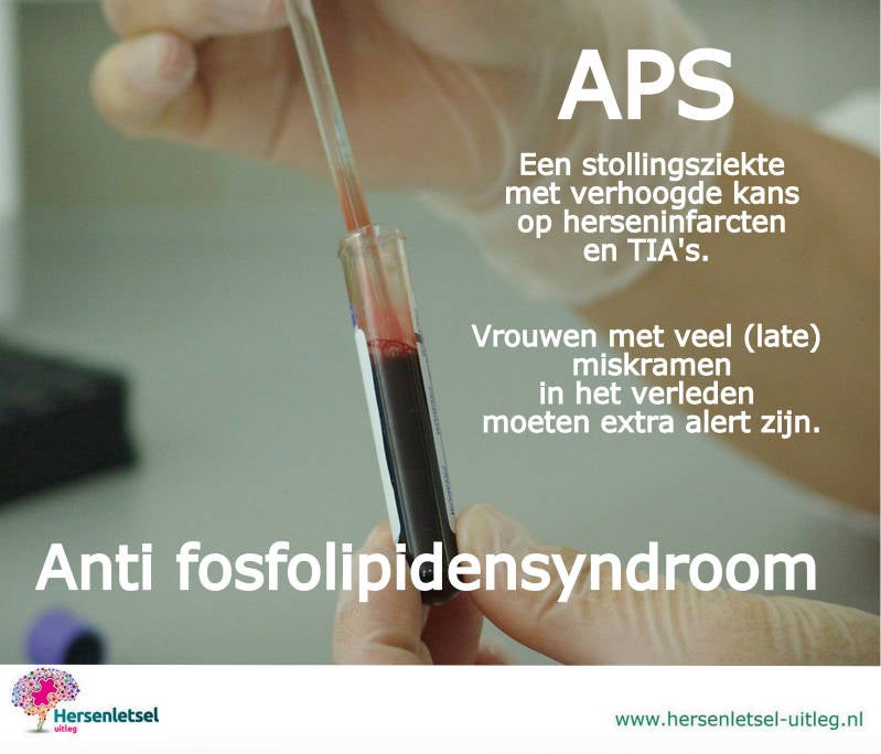 APS is een auto-immuunziekte die de stolling beïnvloedt. Daardoor kunnen er bloedstolsels in de bloedvaten komen en deze afsluiten. Dat kan leiden tot een herseninfarct of TIA.