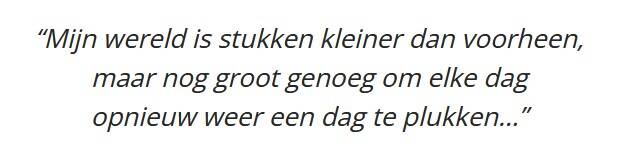 Mijn boek is geen succesverhaal, maar het geeft iedereen inzicht in hoe mijn leven van de één op andere dag is veranderd. Ik omschrijf wat mij is overkomen, wat ik heb gedaan om te komen waar ik nu ben en wat ik nog wel en niet kan. Ik deel persoonlijke en praktische tips en dierbaren en professionals komen aan het woord.