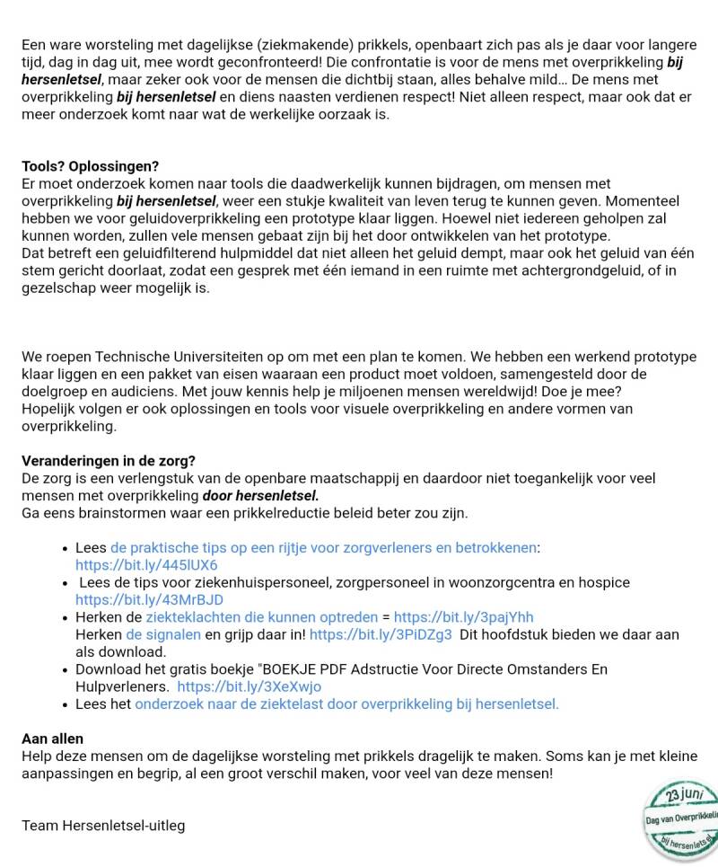 Met deze dag trachten wij meer bewustwording over overprikkeling als gevolg van hersenletsel te realiseren en kennis over te dragen. Vele organisaties haakten aan bij ons initiatief, waaronder de hersenstichting, hersenletsel.nl (via social media), de prikkelarme cultuuragenda, verder met hersenletsel, siza, GGZ.nl, issuekalender, odion, libra revalidatie en audiologie, basalt revalidatie, nationale zorggids, de connectkever etc.