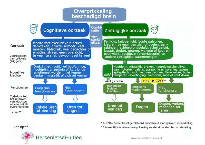 Deze mensen herkenden en erkenden deze klachten onderling en noemden het overprikkeling. De symptomen van het ziektebeeld worden vaak door heel gewone prikkels uitgelokt. Door het hersenletsel kunnen deze prikkels anders worden waargenomen. De symptomen van het hersenletsel kunnen door overprikkeling verergeren. Of de symptomen openbaren zich tijdens een fase van overprikkeling. Denk hierbij aan klachten die lijken op een beroerte, zoals tijdelijke halfzijdige uitval of uitval van spraak.