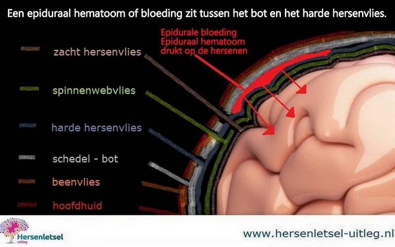 Bij een epiduraal hematoom is er sprake van een bloeduitstorting (hematoom) tussen het harde hersenvlies en het schedelbot. Het hoort eigenlijk onder traumatisch hersenletsel mèt een bloeding. Bij dit hoofdtrauma barst de schedel waarbij een (slag)ader onder het bot scheurt en gaat bloeden.