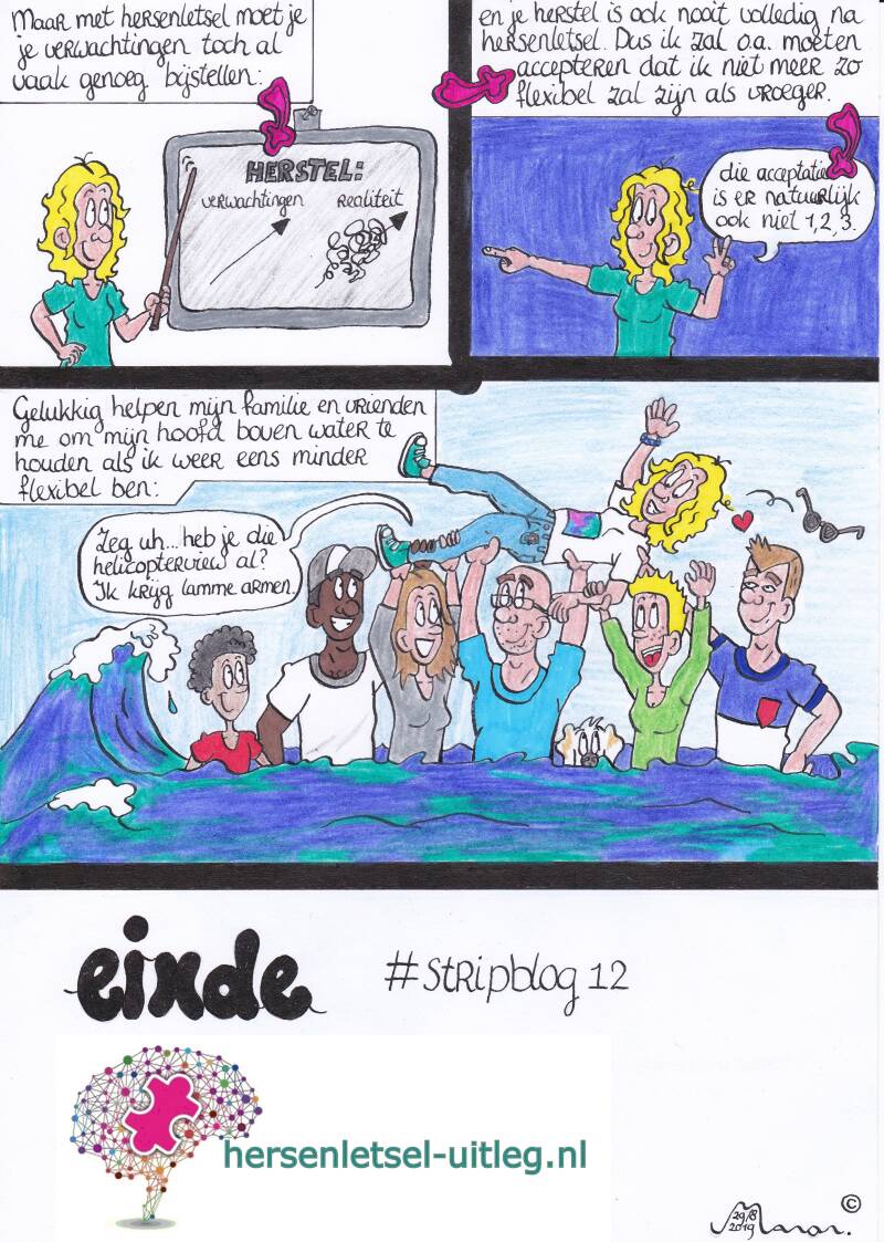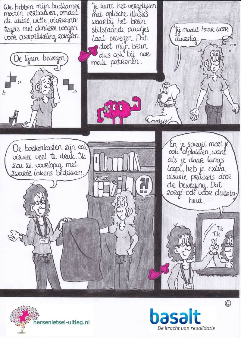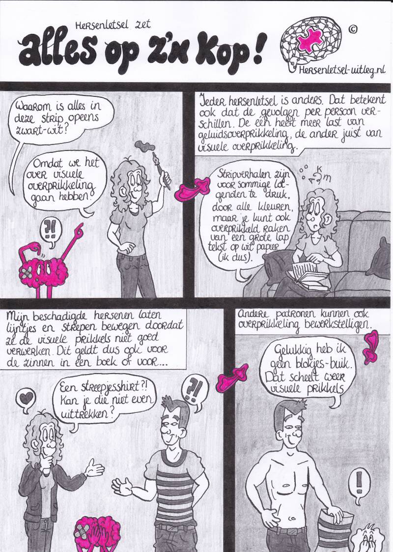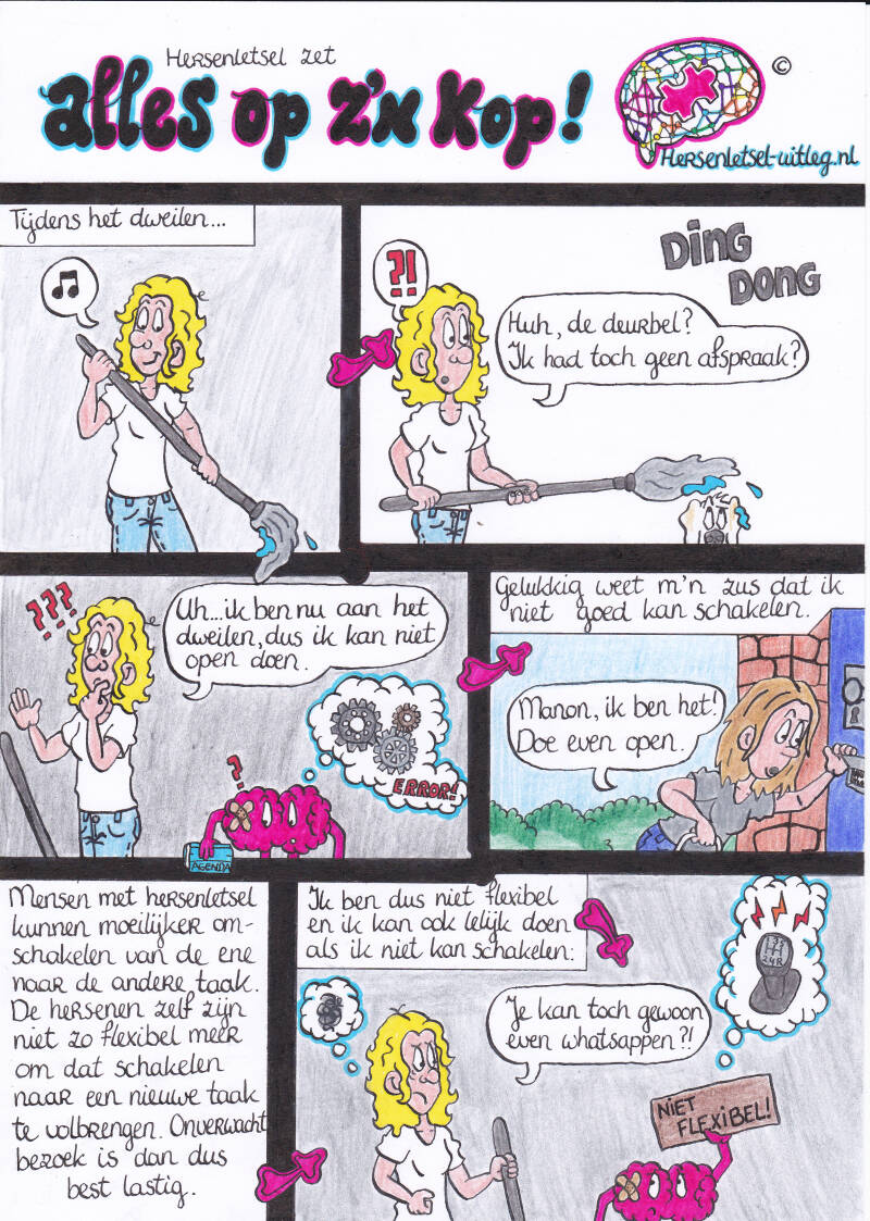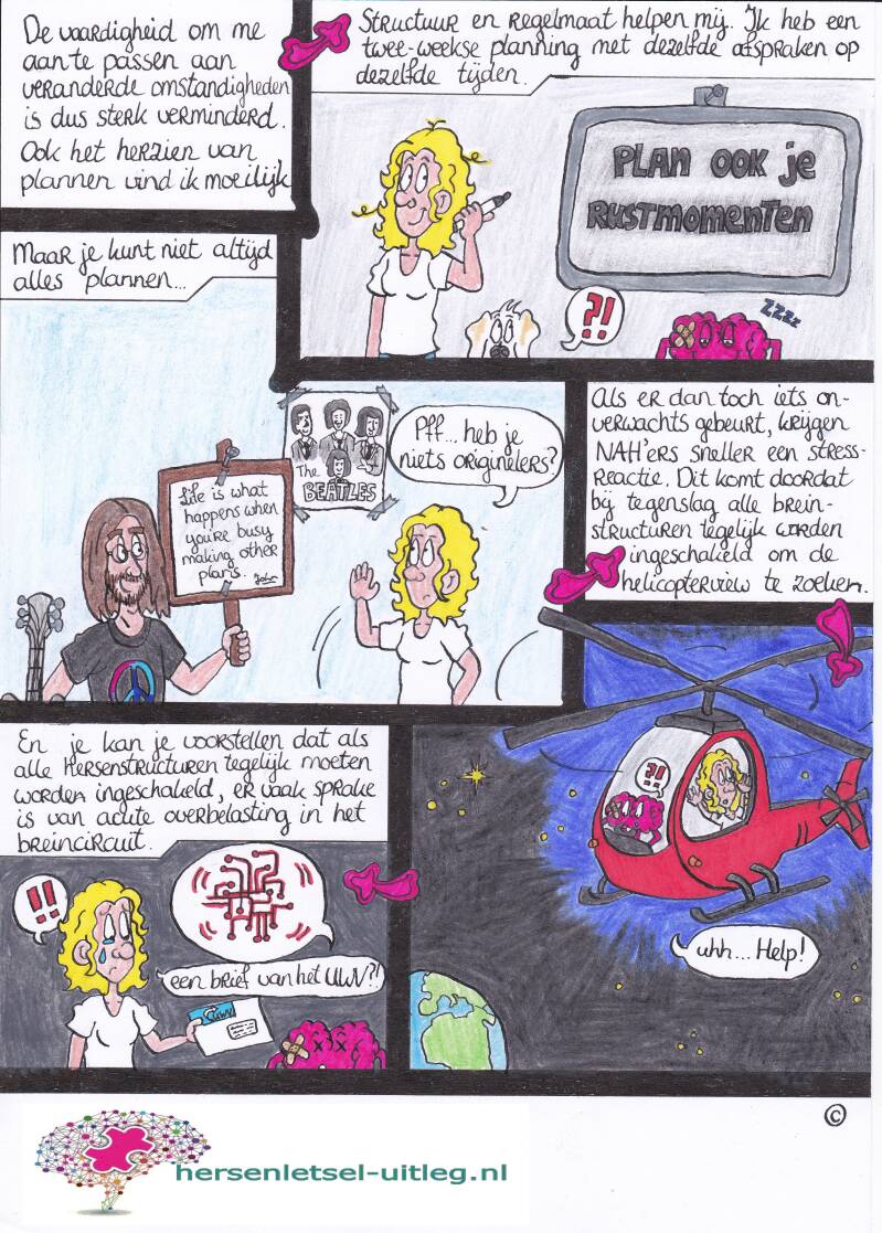 De derde strip op deze pagina gaat over verminderde stressbestendigheid en verminderde flexibiliteit door hersenletsel.