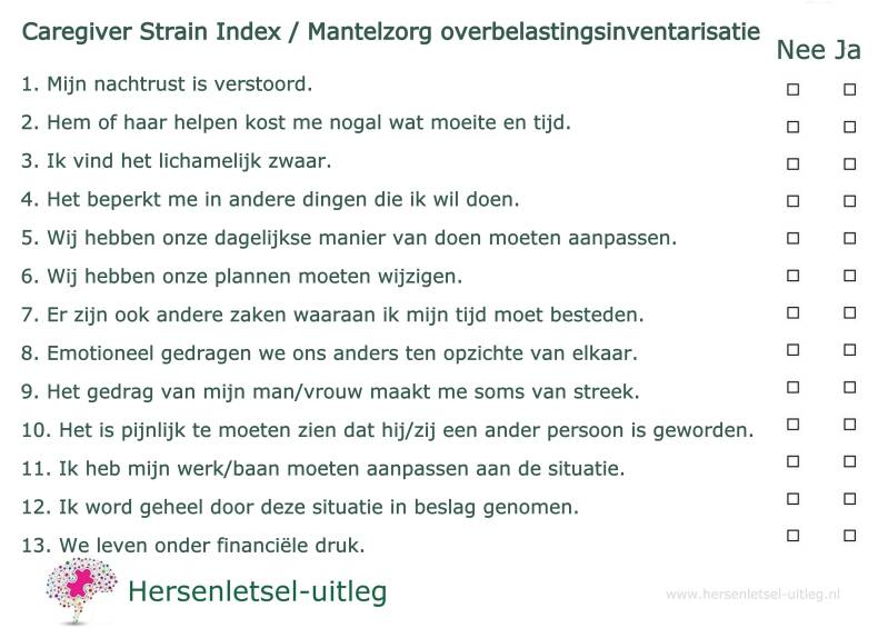 Onder de afbeelding staat een Caregiver Strain Index (mantelzorger overbelasting lijst). Vul die regelmatig eerlijk in, om jezelf in de gaten te houden voor overbelasting.
