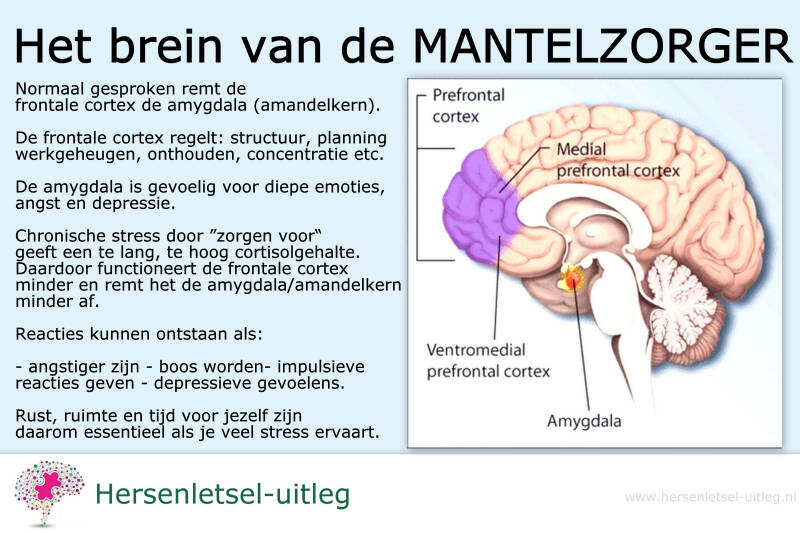 Als door de hoge levels cortisol (door de zorgen) de frontaalkwab minder goed de amygdala kan afremmen, kan die persoon zelf angstiger worden, boos, impulsief gaan reageren en depressief worden. Maar ook minder goed plannen, minder goed nog de structuur vast houden, onthouden. De aandacht en concentratie kunnen afnemen. Kortom het behelst de functies die een gezonde frontaalkwab allemaal moet kunnen doen.
