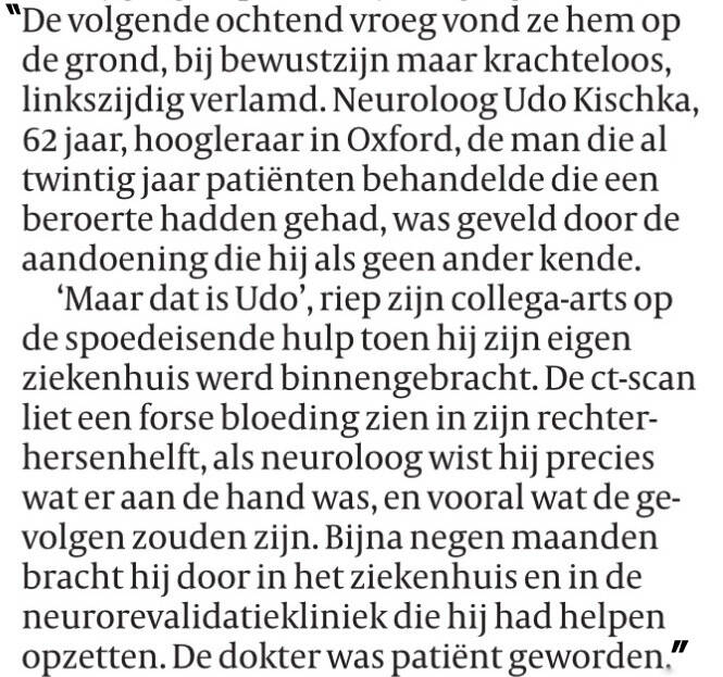 Met dank aan de auteur Udo Kischka, die hier nu voor Hersenletsel-uitleg, fragmenten vrijgeeft, uit zijn boek "Surviving stroke: the story of a neurologist and his family". Mei 2020.