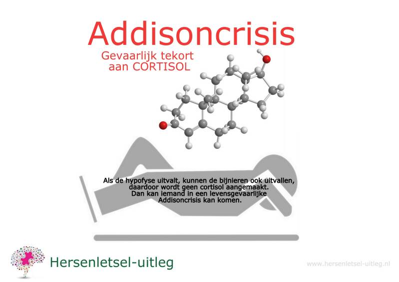 Addisoncrisis Een Addisoncrisis is een levensgevaarlijk tekort aan cortisol. Cortisol zorgt er dus voor dat je 's morgens dus op kan staan maar ook in situaties waar stress om de hoek komt kijken. Dit kan zijn door te druk zijn. Maar ook bijvoorbeeld bij een begrafenis, huwelijk of geboorte. En vergeet niet een ongeluk, de tandarts waar hij misschien moet boren vanwege een gaatje, de dokter een operatie, ziek worden, diarree of overgeven of gewoon even een drankje op het terras doen. Voor iedereen normale dingen maar voor een Addison crisis patiënte is dit niet zo normaal. Dit kan 5 keer goed gaan en ineens kan het mis gaan en kan je er binnen 5 minuten niet meer op deze wereld zijn.