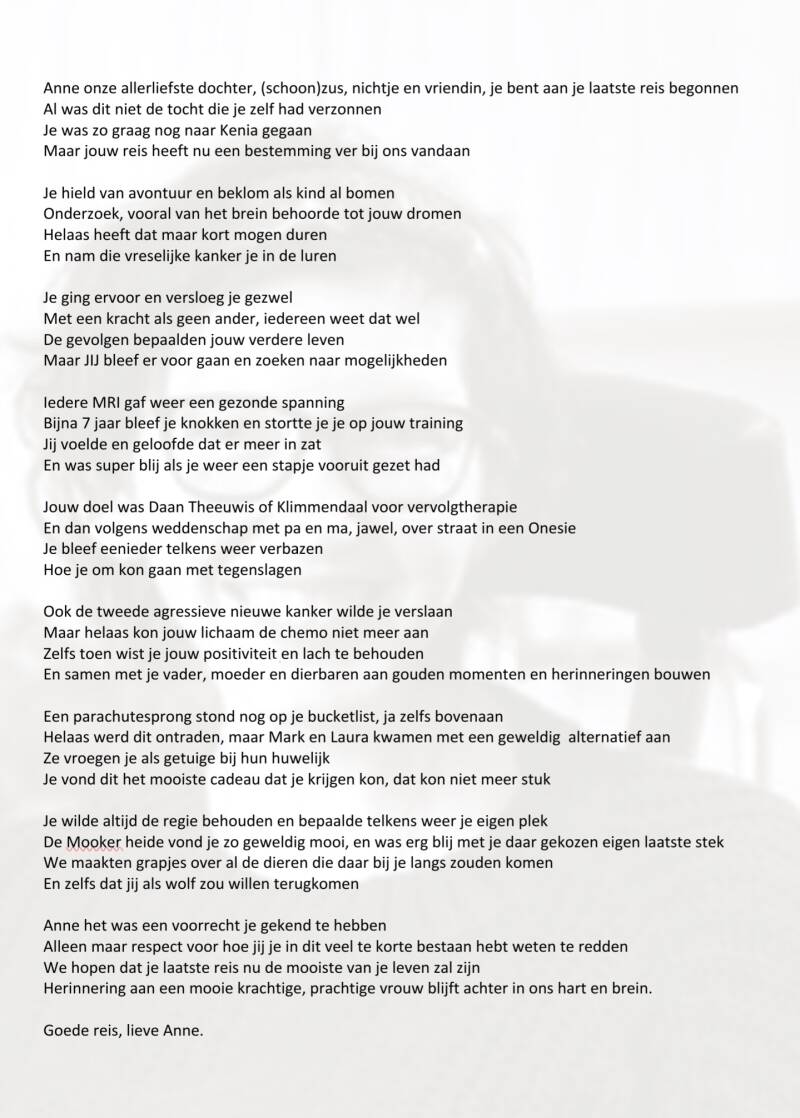 Helaas, helaas is Anne, nadat bij haar een tweede (agressieve) vorm van kanker ontdekt werd, toch overleden.