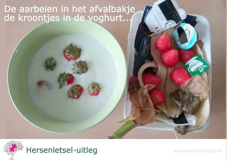 "Ik wilde de kroontjes van de aardbeien afhalen. Dat deed ik keurig. Ik gooide vervolgens de kroontjes in de yoghurt en de aardbeien in het afvalbakje...."![]()