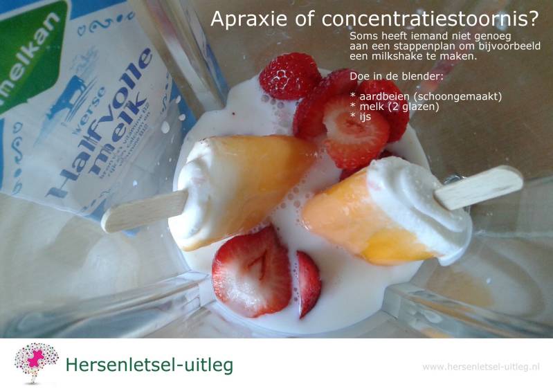 "Was het mijn concentratiestoornis of toch mijn apraxie waarbij ik alles door elkaar haal ? Ik wilde een milkshake maken volgens de stappenplan van mijn begeleider.... Ik las: "Doe ijs, melk en aardbeien in de blender en stopte zonder na te denken twee ijsjes in de blender ...met houtjes en al".