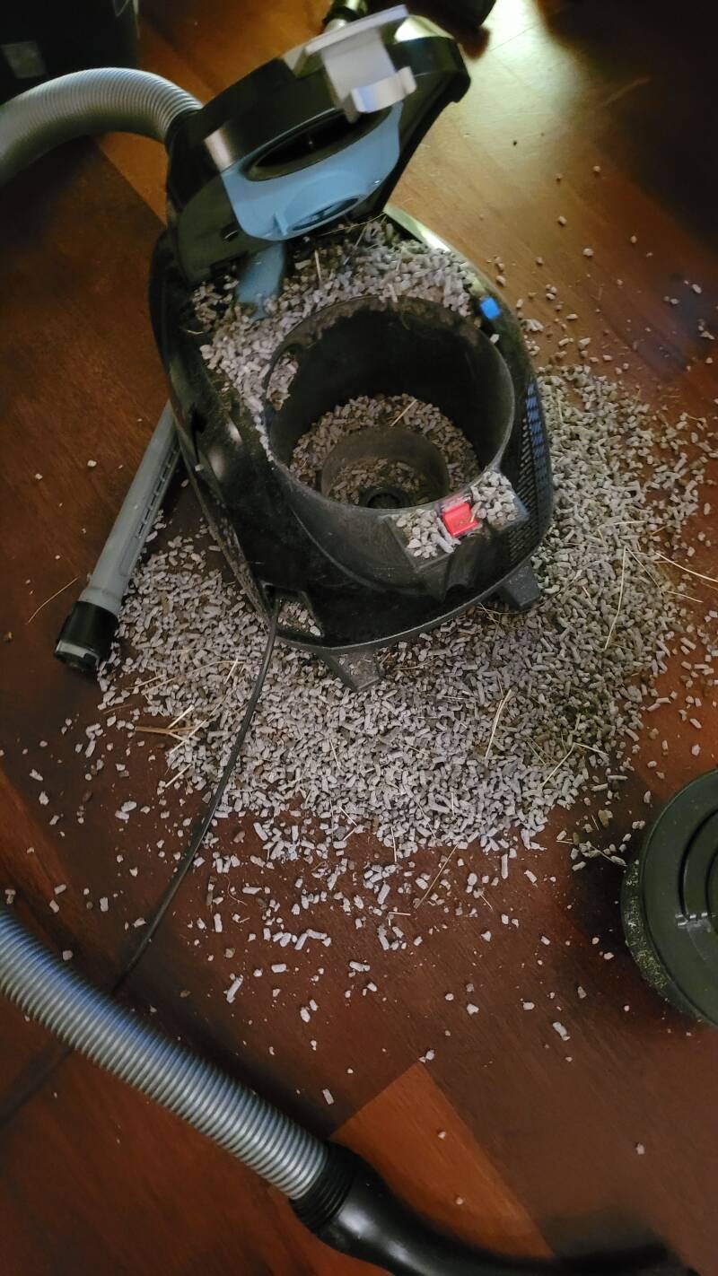 Na het schoonmaken van de cavia kooi, wilde ik de bak van de stofzuiger legen. In plaats van de bak aan de grote handel eruit te trekken, duwde ik vast op de rode knop op de bak te legen... Zie afbeelding hieronder...