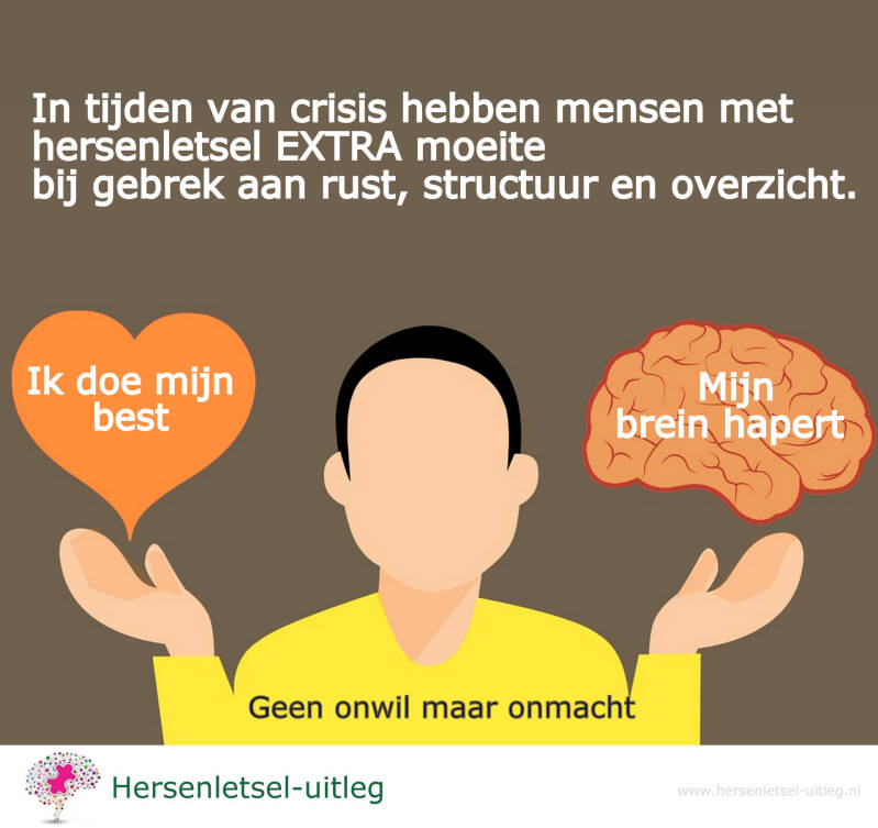 Mensen met hersenletsel in het algemeen zijn minder stressbestendig (lees waarom in de link). Mensen met hersenletsel hebben een grote behoefte aan structuur. Rust en overzicht blijft belangrijk. Hersenen kunnen overuren maken. Daardoor kunnen mensen prikkelbaar (boos), onrustig of angstig worden. Dat heeft allemaal óók een groot effect op de partners/mantelzorgers.