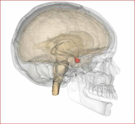 De hypofyse (de rode stip) is zo klein als een erwt maar de belangrijkste klier in het menselijk lichaam.