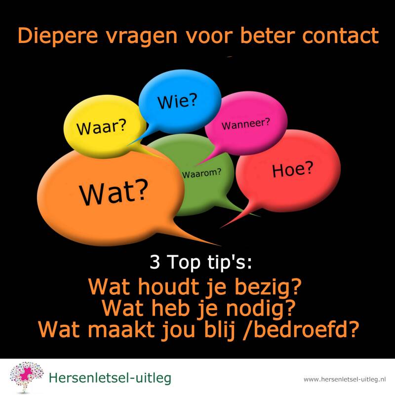 Ook voor de mens zonder hersenletsel kan het waardevol zijn om de 'wat', 'waarin', 'wanneer', 'waarom' en 'hoe' vragen te stellen (open vragen). Deze vragen geven de ander de kans om te delen wat voor hen belangrijk is, waardoor ze zich gezien en gehoord voelen. Dit vraagt echter om aandachtig luisteren, want nu ga je écht belangrijke onderwerpen bespreken. Iemand kan nu niet alleen met ja of nee antwoorden (de gesloten vragen).Wat houdt je bezig?