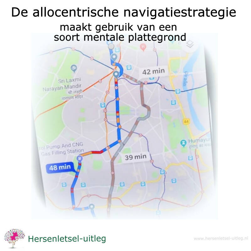 Voorbeeld: "bij de bakker linksaf, bij het rode torentje rechtdoor en bij het voetbalpleintje rechts dan kom ik uit bij de markt." - Mensen die als navigatiepunt een vorm van helikopterblik hanteren. Dat wil zeggen dat zij een mentale plattegrond van de omgeving voor zich zien in hun geest (allocentrische strategie).
