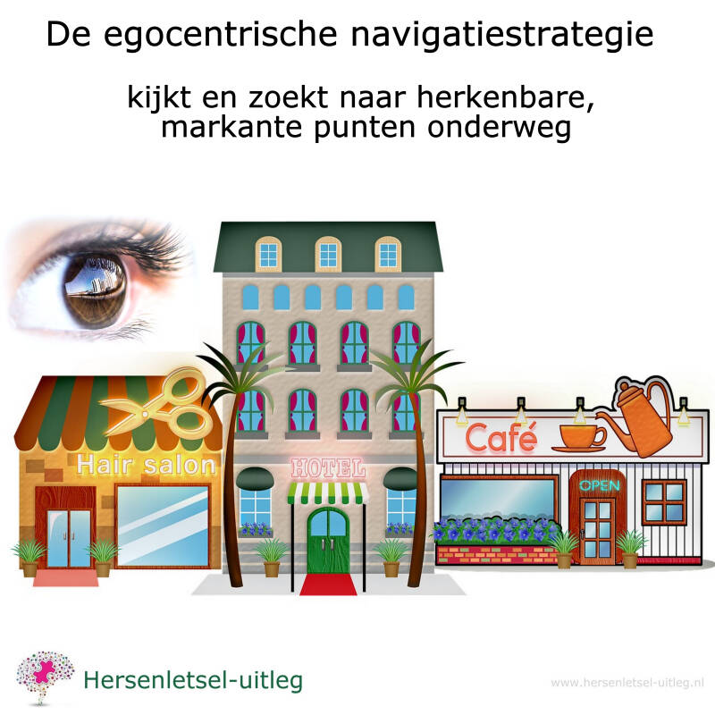 - Mensen die als navigatiepunt zich zelf als middelpunt van de ruimte beschouwen en van daaruit naar de omgeving kijken, om bijvoorbeeld herkenbare gebouwen of markante plekken in zich op te nemen. Van daaruit weten ze of ze links of rechts moeten afslaan (egocentrische strategie).