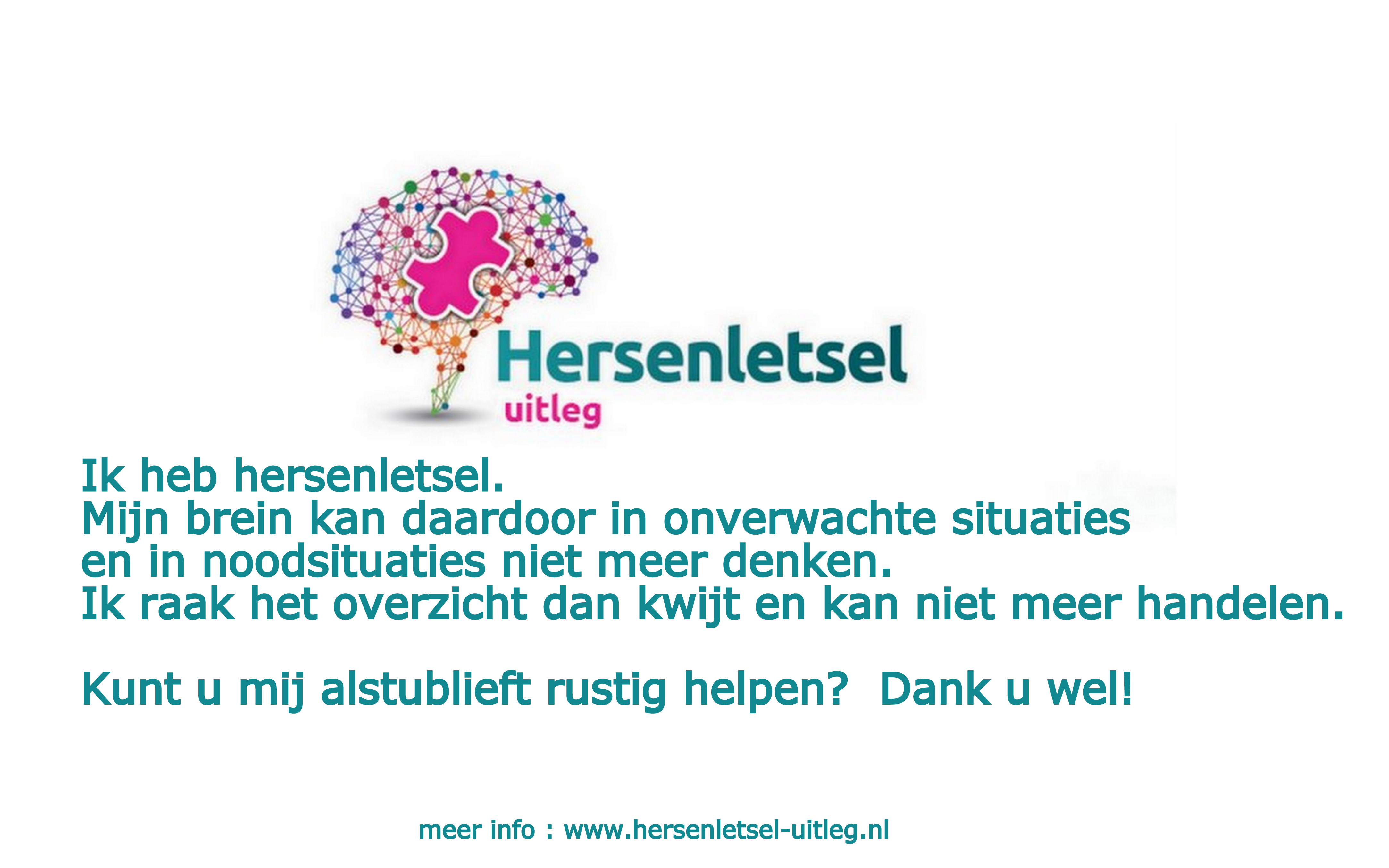 • Leg na afloop van de stressende situatie uit dat de hersenen na hersenletsel deze 'overload' van het gelijktijdig moeten gebruiken van breinstructuren niet aankan. Je omgeving zal je hopelijk meer begrip voor je hebben een volgende keer. Wijs ze op deze pagina.