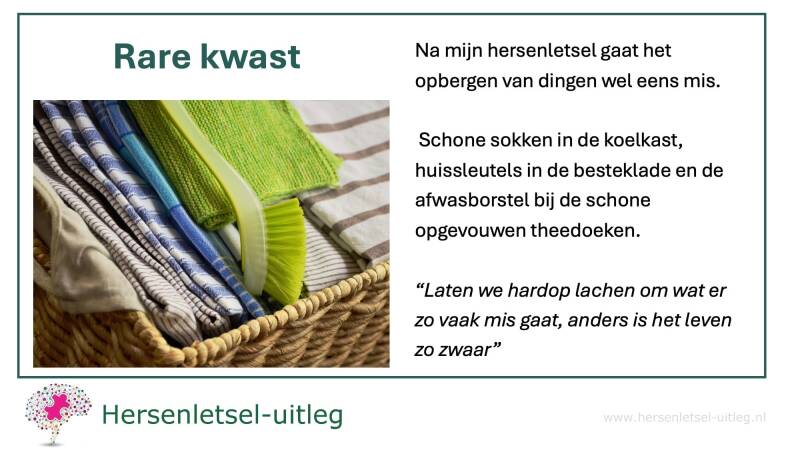 Verstrooidheid, het fenomeen waarbij mensen voorwerpen op volstrekt ongepaste plekken terugvinden, kan een uiting zijn van hersenletsel. Verstrooidheid wordt veroorzaakt door verstoringen in de hersenfuncties die verantwoordelijk zijn voor geheugen, aandacht en planning.