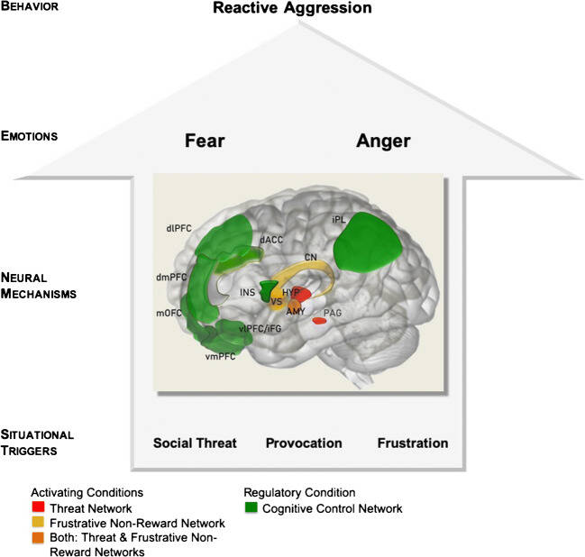 * belangrijkste hersengebieden met een dreigingsgevoeligheid en frustrerende geen-ontvangen-beloning als activerende voorwaarden en cognitieve controle als regulerende voorwaarde voor reactieve agressie:
