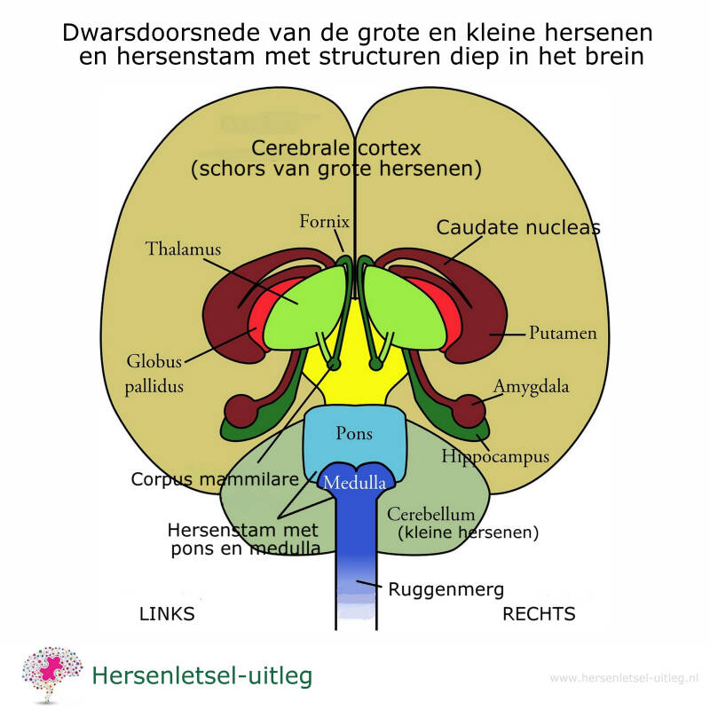De hersenschors, de diepere delen van de hersenen en het gebied tussen de hersenen en de hersenstam