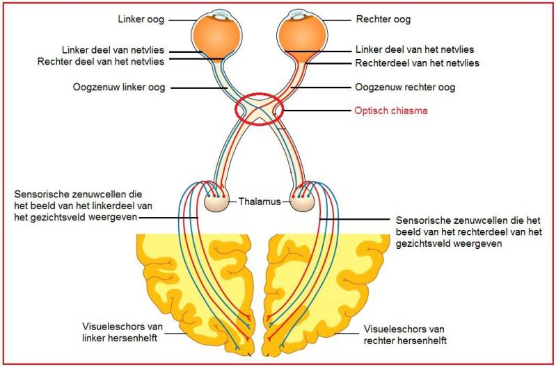 Zie hieronder een schematisch plaatje van de hersengebieden die bij het zien, bij het visuele systeem betrokken zijn. Bij hemianopsie kan er in elke van de betrokken gebieden een probleem zijn ontstaan zoals bijvoorbeeld in de optische tractus (de verbinding na het optisch chiasma en de thalamus) en in het gedeelte van de hersenschors waarmee we kunnen kijken (de visuele schors) achter in de hersenen (ook wel occipitaalkwab genoemd).