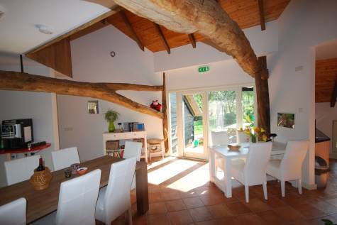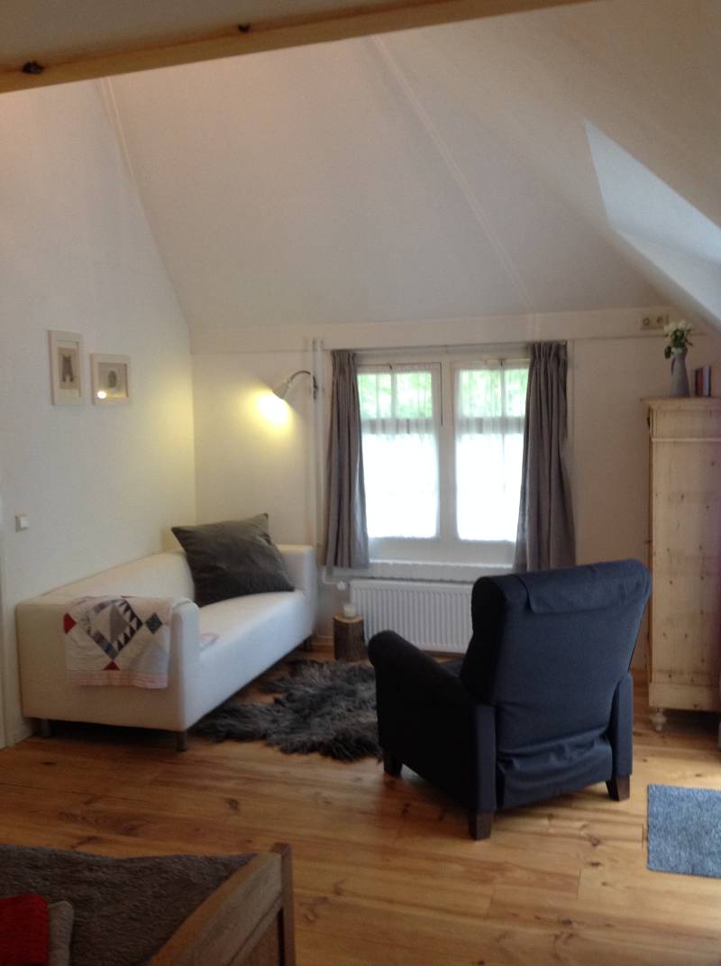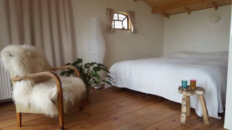 Logeren onder de hanebalken van de boerderij. Het gastenverblijf heeft een eigen ingang en terras en is voorzien van alle comfort, gemakken en faciliteiten. Een compleet ingerichte keuken, een badkamer met ligbad, tweede toilet en een aparte kleedkamer naast je slaapkamer. Het is er stil maar je moet wel een trap op naar het appartement. De B&B-eigenaren wonen in de benedenverdieping. Je huurt het als vakantiewoning, met of zonder ontbijt, als B&B.