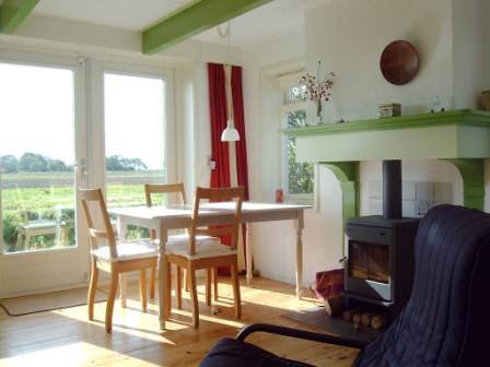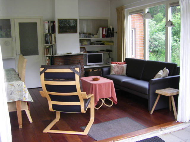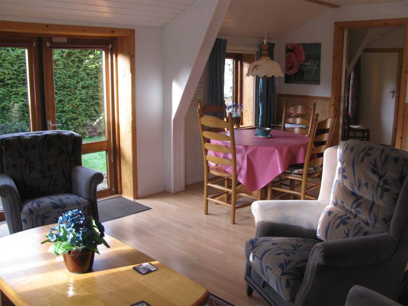 In de gezellige woonkamer staat een bankstel en eettafel, er is een tv en een open haard. Via de openslaande deuren is het overdekte terras op het zuiden bereikbaar.