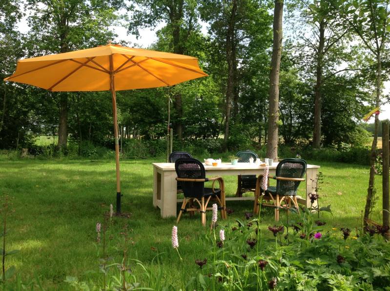 Het ontbijt bestaat o.a. uit versgebakken broodjes, eigengemaakte jam en een eitje van eigen kippen, en wordt geserveerd in de gezellige woonkamer of in de tuin van de B&B.
