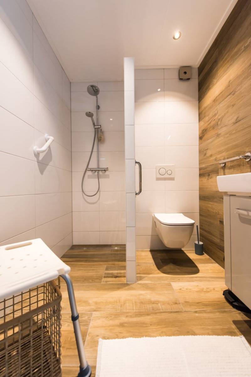 gelijkvloers voor de (behoevende) gasten. In elke woning is een grote, direct in te rijden of lopen toileteenheid en een losse eenheid met inloop- of inrijdouche op de benedenverdieping direct en-suite.