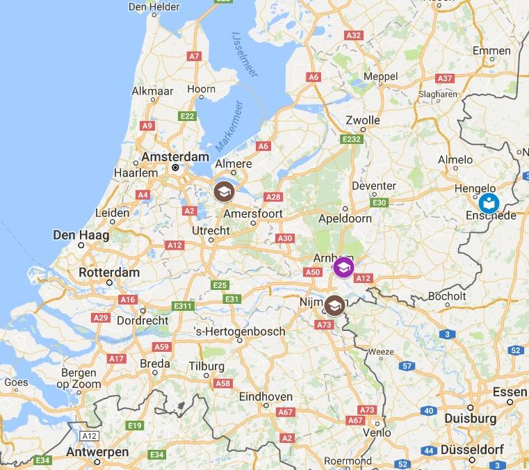 De logo's van de scholen corresponderen met de adresgegevens onder de kaart