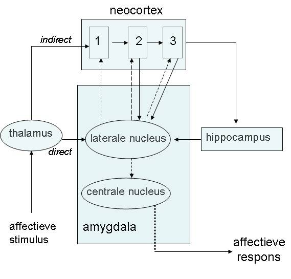 De thalamus geeft op de korte route snel informatie aan de amygdala of middels de lange route aan de hersenschors van de voorhoofdskwab. Daar wordt geanalyseerd wat er gedaan moet worden en pas dan wordt de informatie naar de amygdala gestuurd.