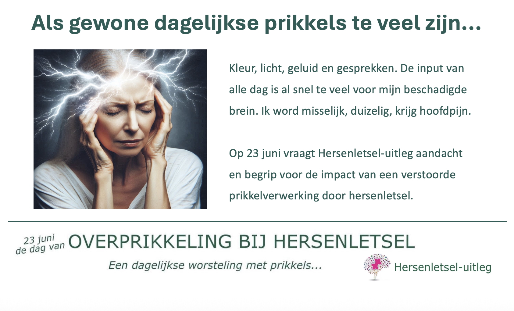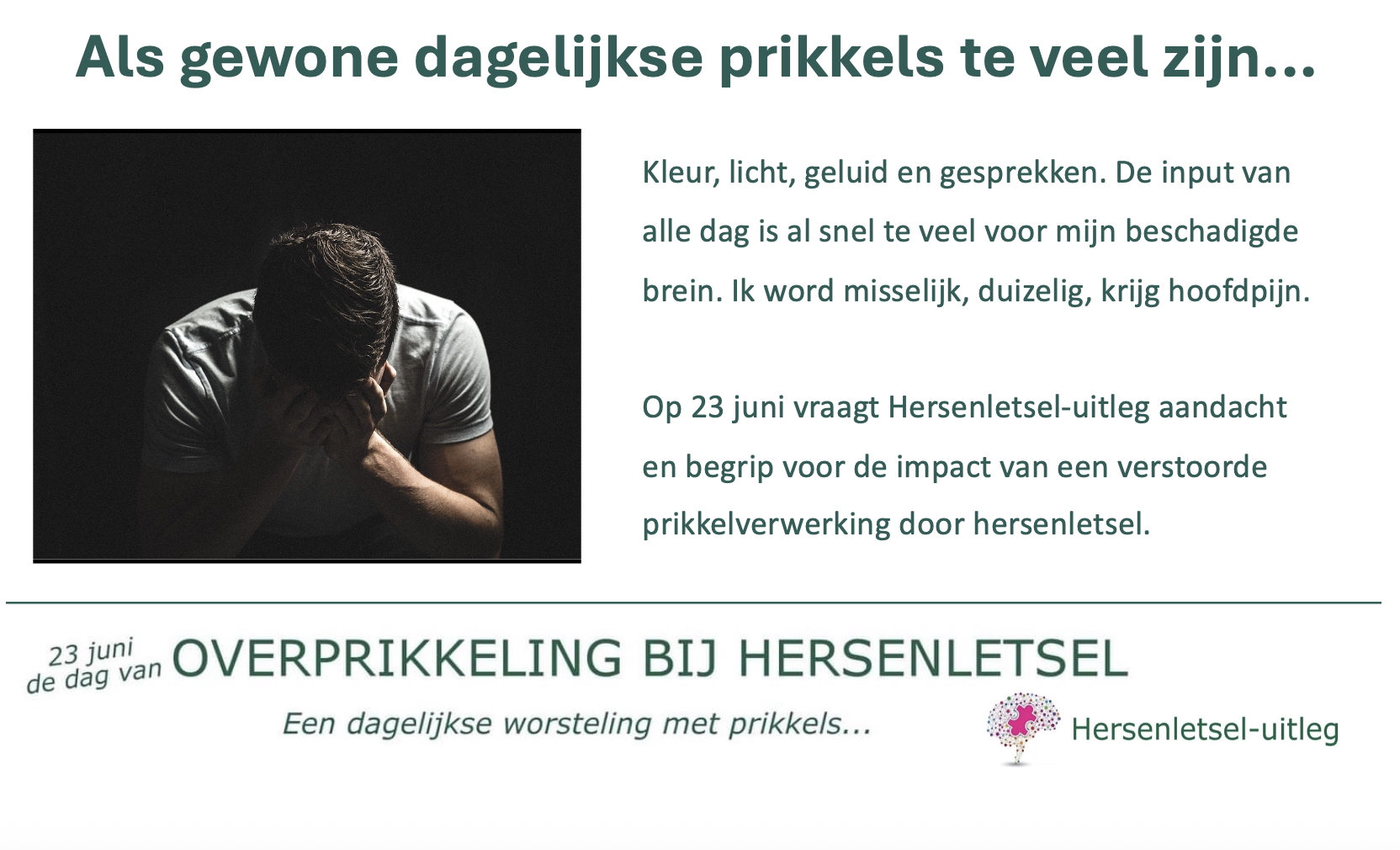 Samen zorgen we voor minder leed door onbegrip, en voor meer medeleven bij deze vaak onbegrepen chronische en onzichtbare ziekte overprikkeling bij hersenletsel.