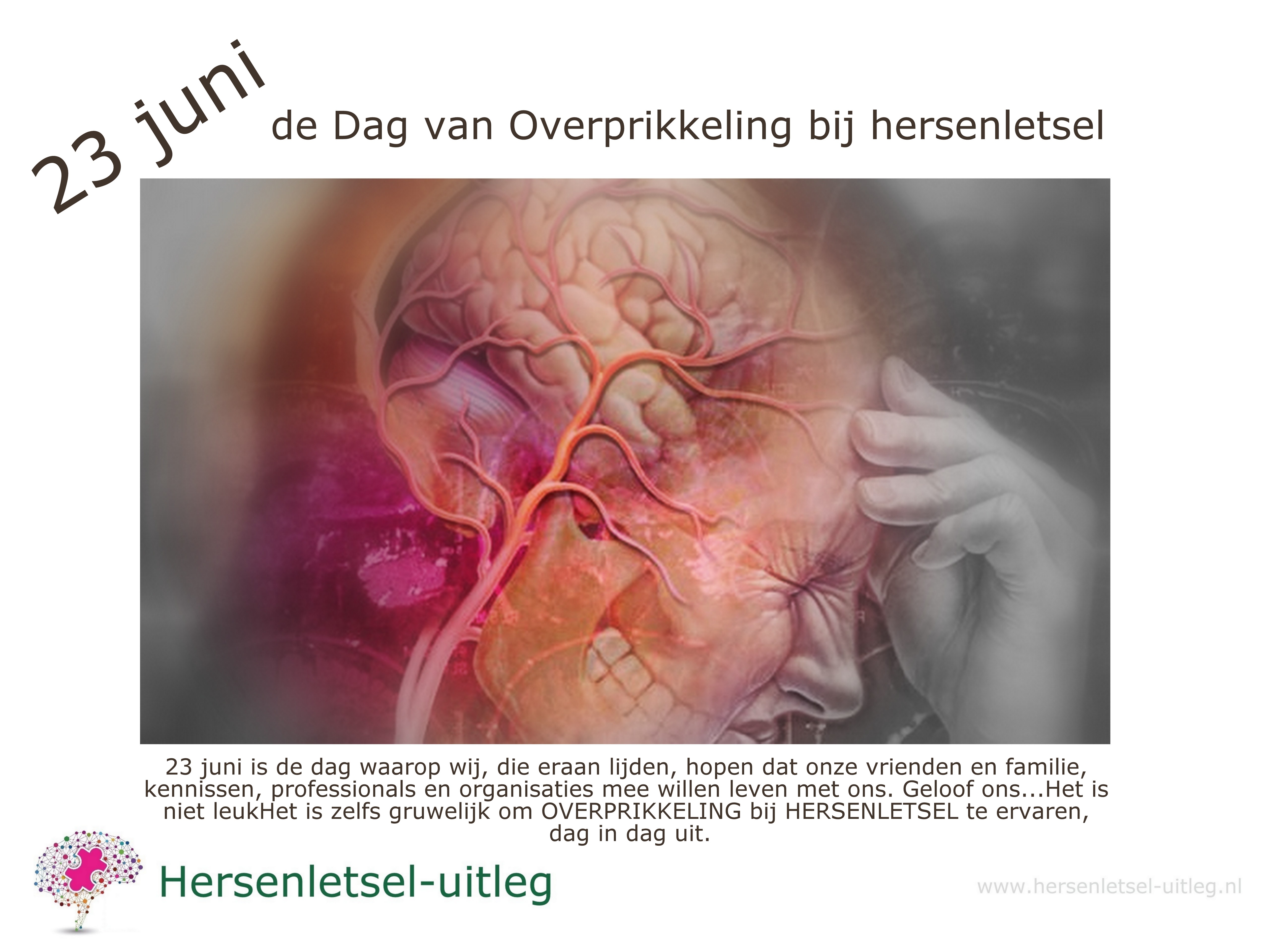 De teamleden van Hersenletsel-uitleg hebben de datum 23 juni gekozen om de initiator van Hersenletsel-uitleg te eren op haar geboortedag. Zij is het boegbeeld van iemand met zo'n ernstige overprikkeling dat een totaal geïsoleerd leven de enige optie was. Er was tevens nergens plek voor haar in de reguliere gezondheidszorg.