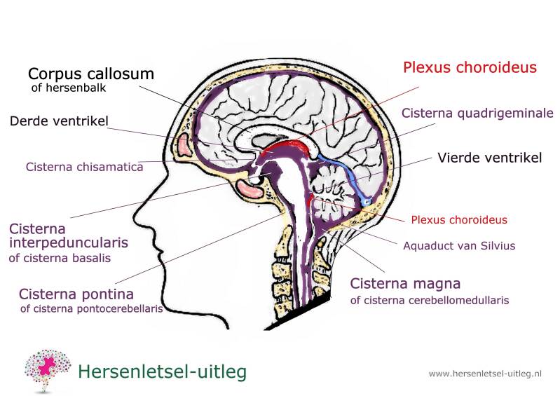 Op de tekening hieronder zie je in het paars de subarachnoïdale ruimte met de ventrikels (of hersenholtes) en her en der een 'cisterna', waar het hersenvocht doorstroomt.