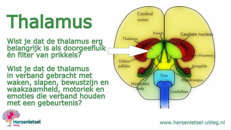 De thalamus heeft zes apart functionerende kerngroepen waar specifieke klachten bij horen als er letsel optreedt. Waar informatie uit andere delen van het zenuwstelsel wordt overgedragen naar specifieke gebieden in de hersenschors (cortex).